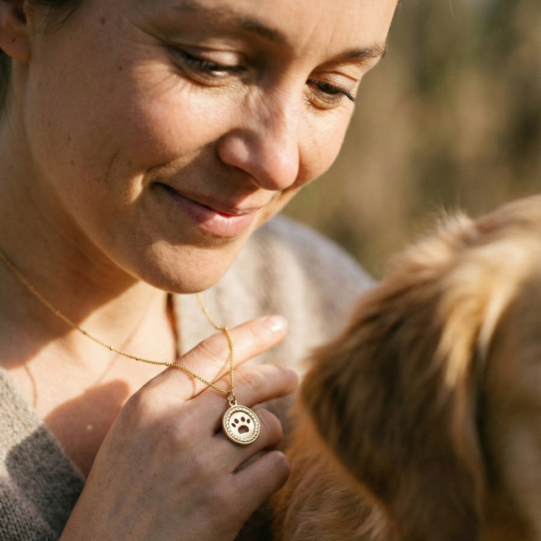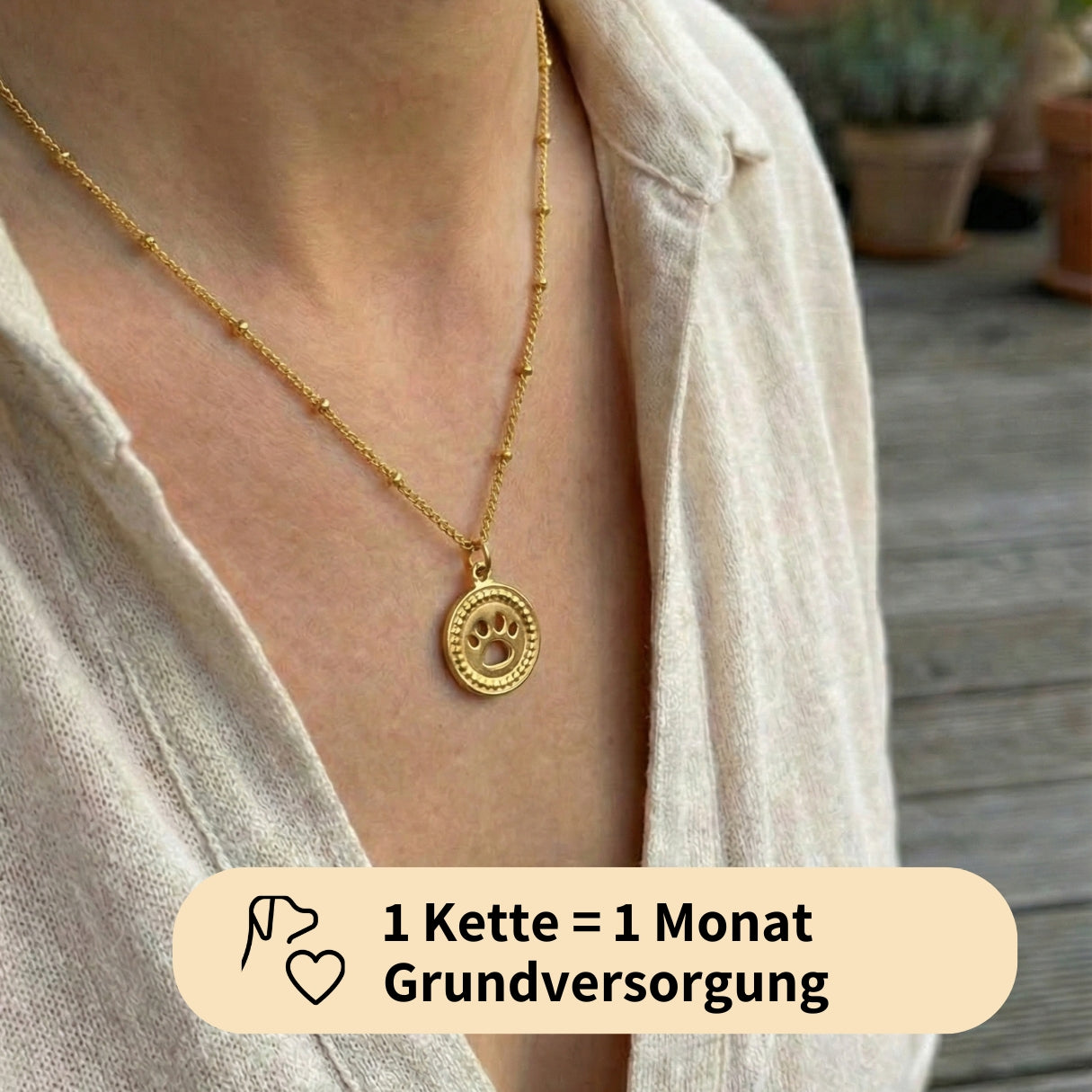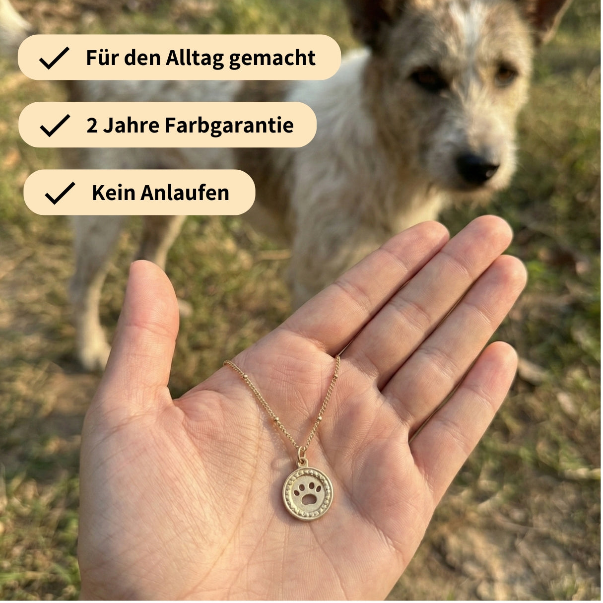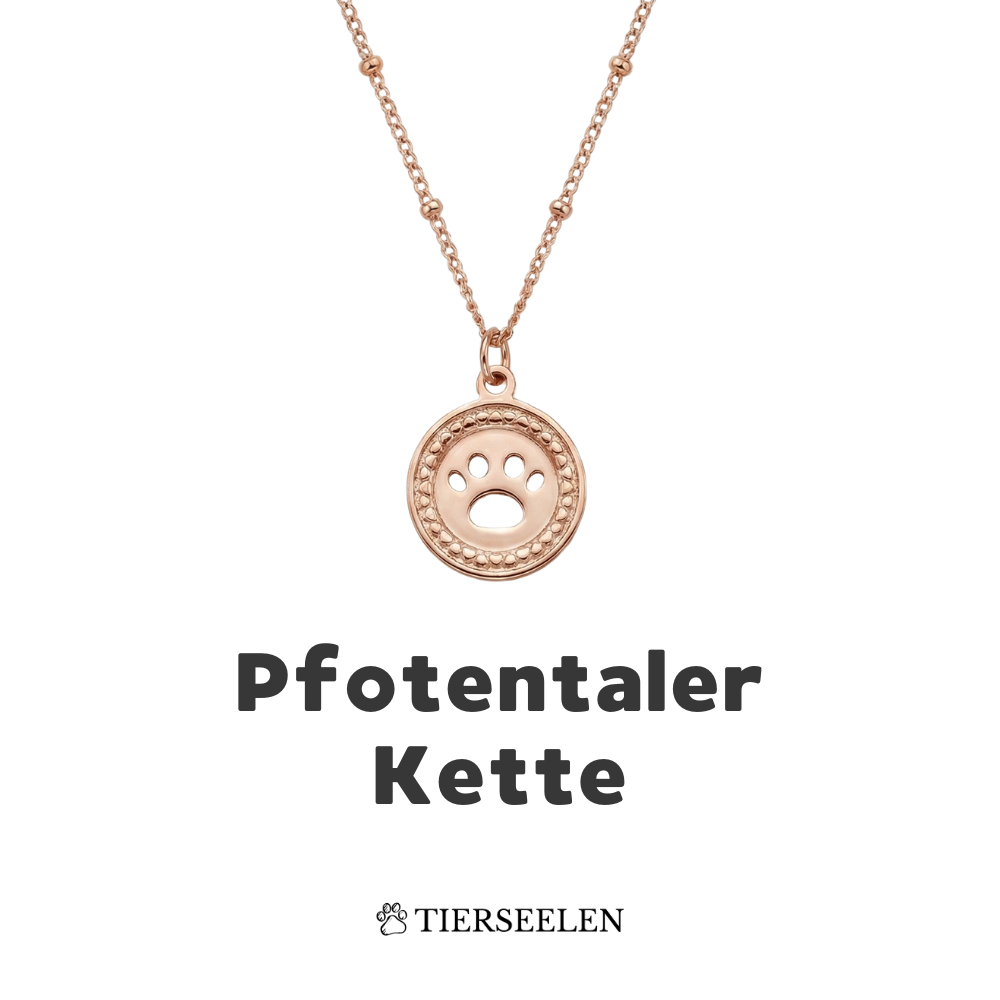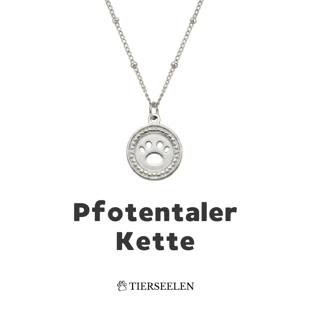 Die Pfotentaler Kette besteht aus hochwertigem Edelstahl. Der runde Anhänger wurde mit viel Liebe zum Detail gestaltet und zeigt eine fein ausgearbeitete Pfote als zentrales Symbol der Verbundenheit. Die silberne Kette ist zusätzlich platinisiert und sorgt für besondere Langlebigkeit und strahlenden Glanz. Die goldene und rosegoldene Variante sind mit 18k Gold vergoldet und verleihen dem zeitlosen Design eine edle Note.