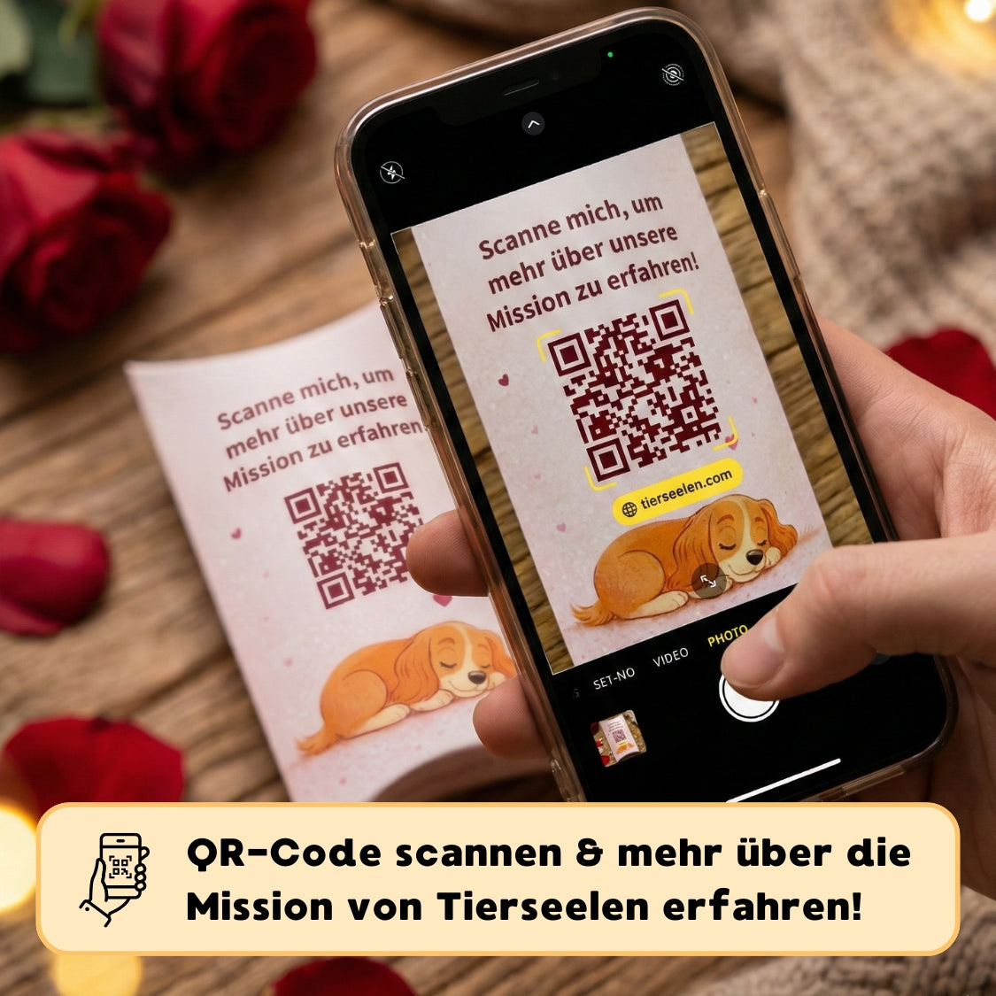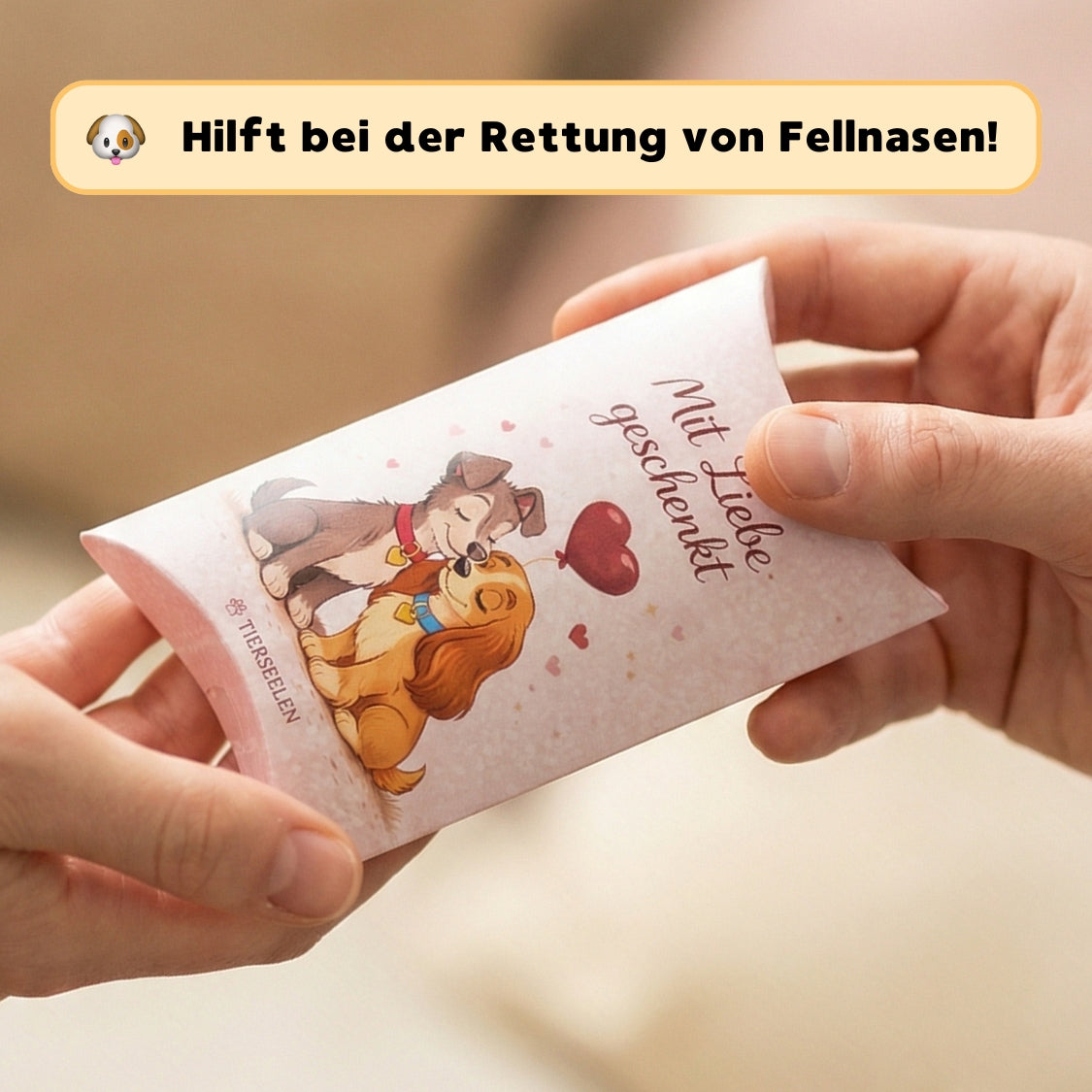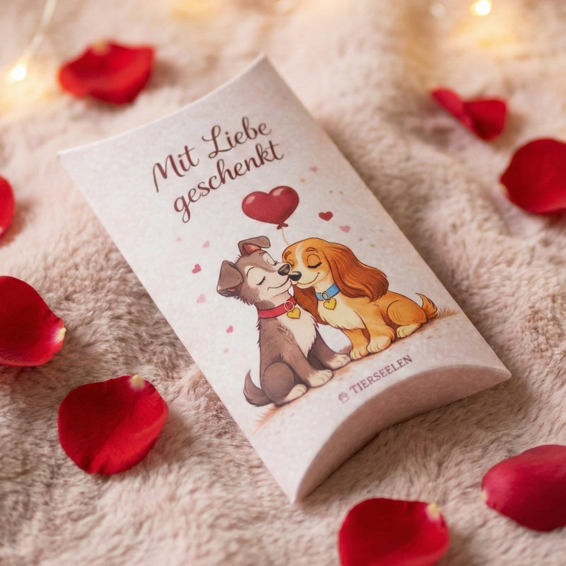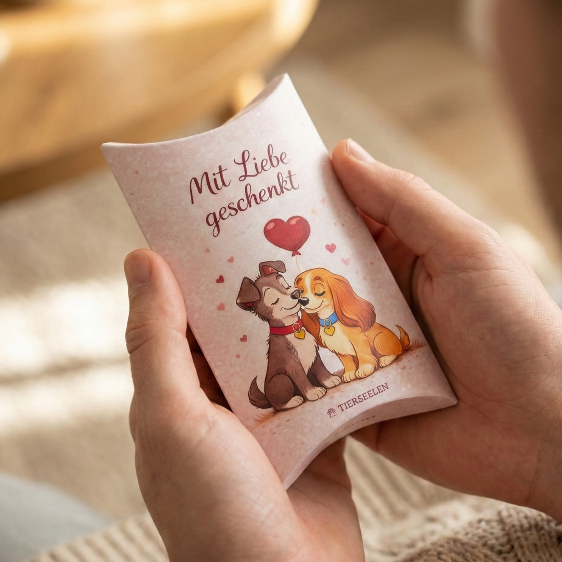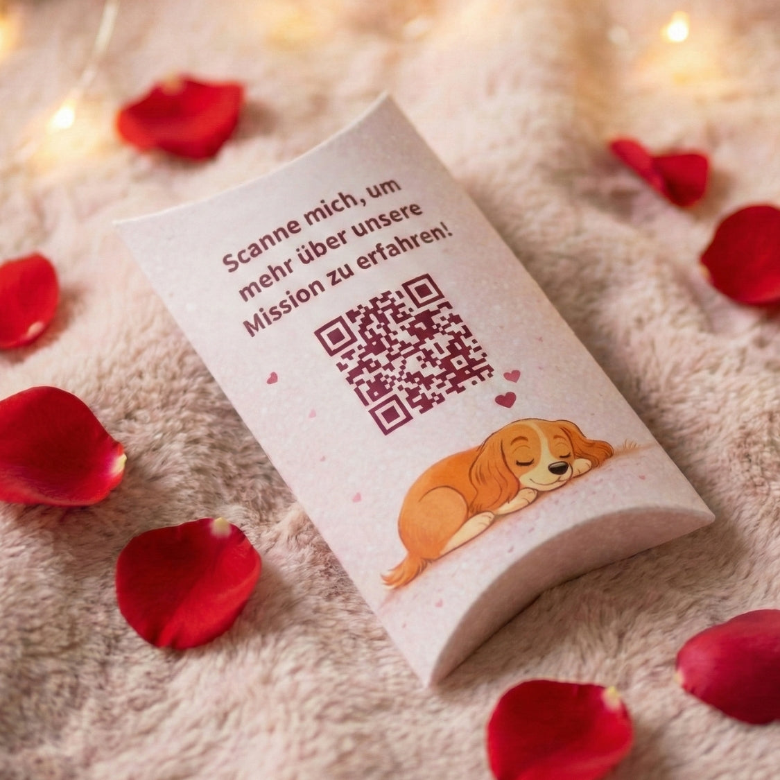 Die hochwertige Pillow-Box aus umweltfreundlichem Karton erstrahlt in zarten Valentinstagsfarben und zeigt auf der Vorderseite ein liebevolles Hundemotiv voller Nähe und Verbundenheit. Auf der Rückseite befindet sich ein scannbarer QR-Code, der direkt zu unserer Herzensmission führt: der Rettung von Straßenhunden in Rumänien.